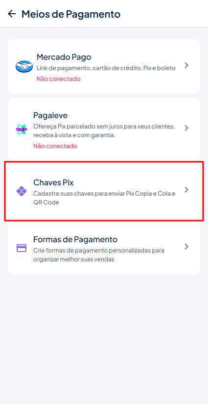 Você pode cadastrar suas chaves para enviar Pix Copia e Cola e QR Code para seus clientes em pedidos manuais nas vendas presenciais (para sua loja use o Mercado Pago ou Pagaleve). Para isso siga os passos a seguir:
