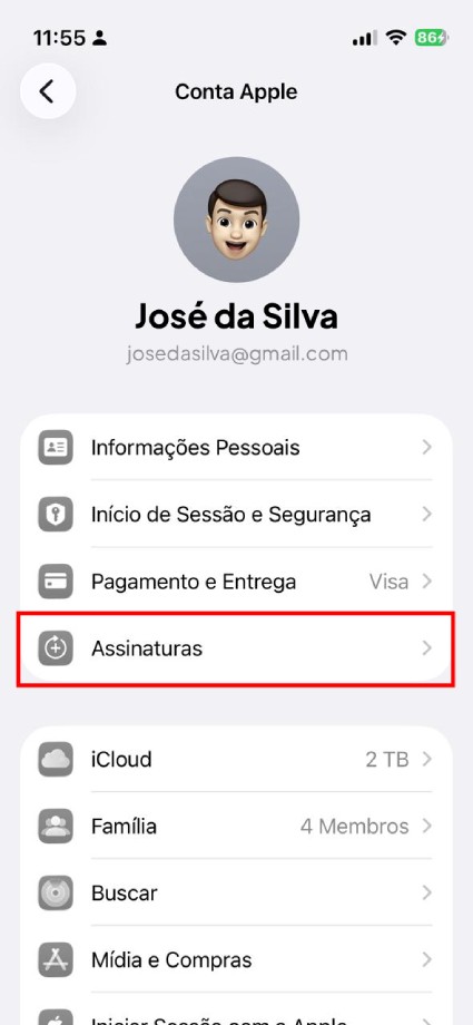 Dentro do seu perfil, toque na opção Assinaturas.É aqui que ficam listados todos os serviços pagos vinculados ao seu Apple ID.
