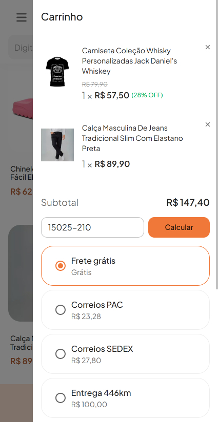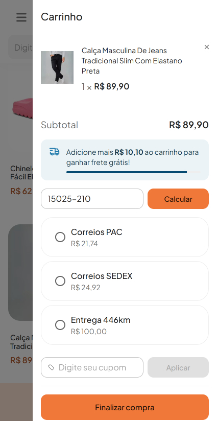 - Valor mínimo do pedido – Neste campo você deve definir o valor mínimo que o pedido deve alcançar, para a opção Frete Grátis ficar disponível para seu cliente em sua loja. Um indicador em seu carrinho de compras irá exibir a diferença que falta para alcançar o valor necessário.