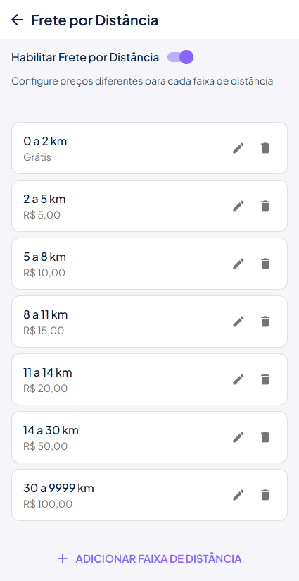 O Frete por Distância calcula o valor da entrega com base na distância entre a loja e o endereço do cliente. Essa opção é útil para definir preços mais justos, de acordo com a quilometragem percorrida.