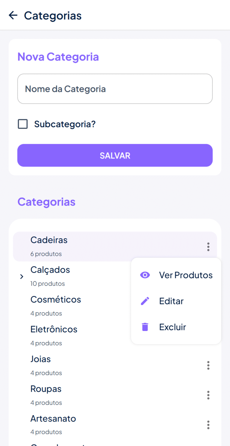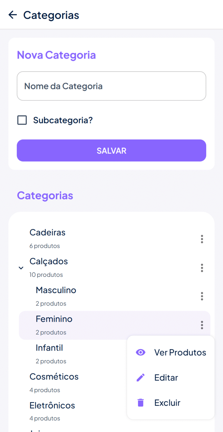 Para excluir uma categoria ou subcategoria, basta clicar no menu “3 pontinhos” nela e selecionar Excluir. Você também pode editá-la ou ver todos os produtos pertencentes à ela.