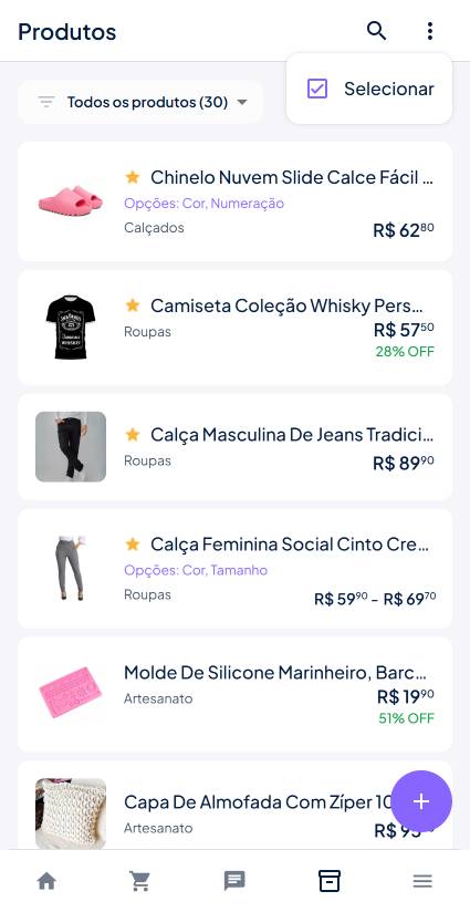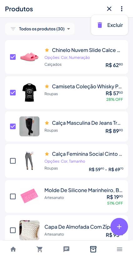 Para excluir um produto ou vários, basta ir até o menu “3 pontinhos” no canto superior direito da tela, clicar em Selecionar, selecionar os produtos que quer excluir e em seguida no mesmo menu, clicar em Excluir.