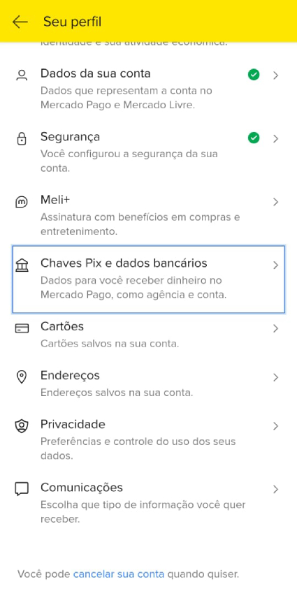 • Configurar Chaves Pix – No seu aplicativo do Mercado Pago vá até o Topo da Home: Seu perfil > Chaves Pix e dados bancários. Suas chaves Pix ficarão disponíveis como opção de pagamento no checkout transparente da sua loja online e nos links de pagamento dos pedidos manuais nas vendas presenciais.