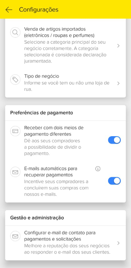 • Compras com 2 cartões – No seu aplicativo do Mercado Pago vá em Menu Mais > menu Cobrar > card Ferramentas: ícone Ver mais > ícone Configuração (última opção) > card Preferências de pagamento > ativar “Receber por dois meios de pagamento diferentes”. Isso torna possível seu cliente pagar com 2 cartões de crédito diferentes uma mesma compra, na finalização do pedido no checkout transparente da sua loja online e nos links de pagamento dos pedidos manuais nas vendas presenciais.