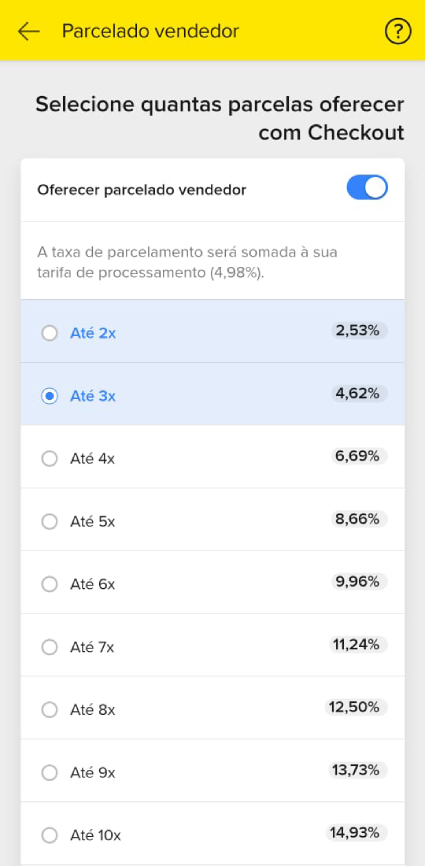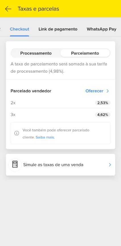 • Parcelamentos sem juros para seu cliente – No seu aplicativo do Mercado Pago vá em Menu Mais > menu Cobrar > card Ferramentas: ícone Taxas e parcelas > aba Checkout e/ou Link de Pagamento > aba Parcelamento > link “Oferecer”. Com essa configuração, você consegue oferecer parcelas sem juros para seus clientes, sendo que você assumiria o pagamento desses juros. Ficaria disponível nos pagamentos parcelados via cartão de crédito, na finalização do pedido no checkout transparente da sua loja online e nos links de pagamento dos pedidos manuais nas vendas presenciais.